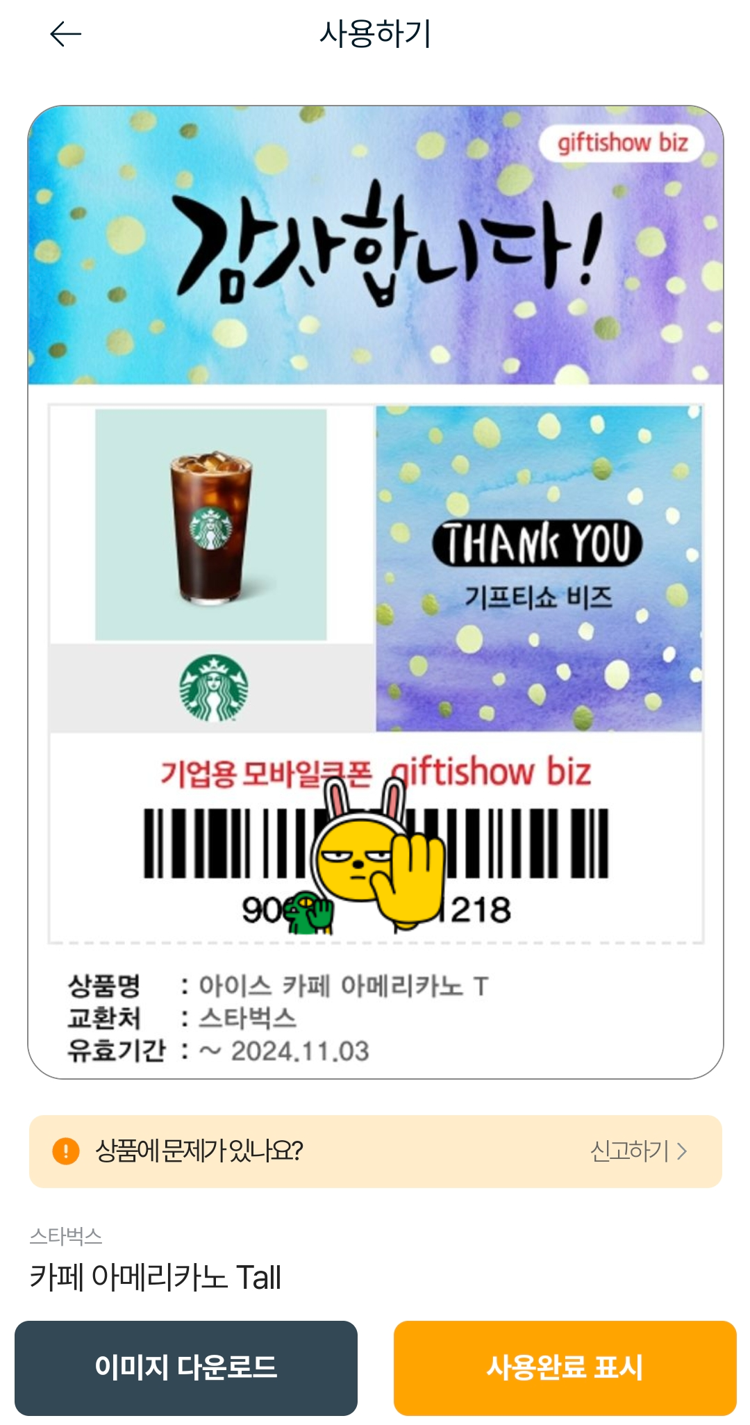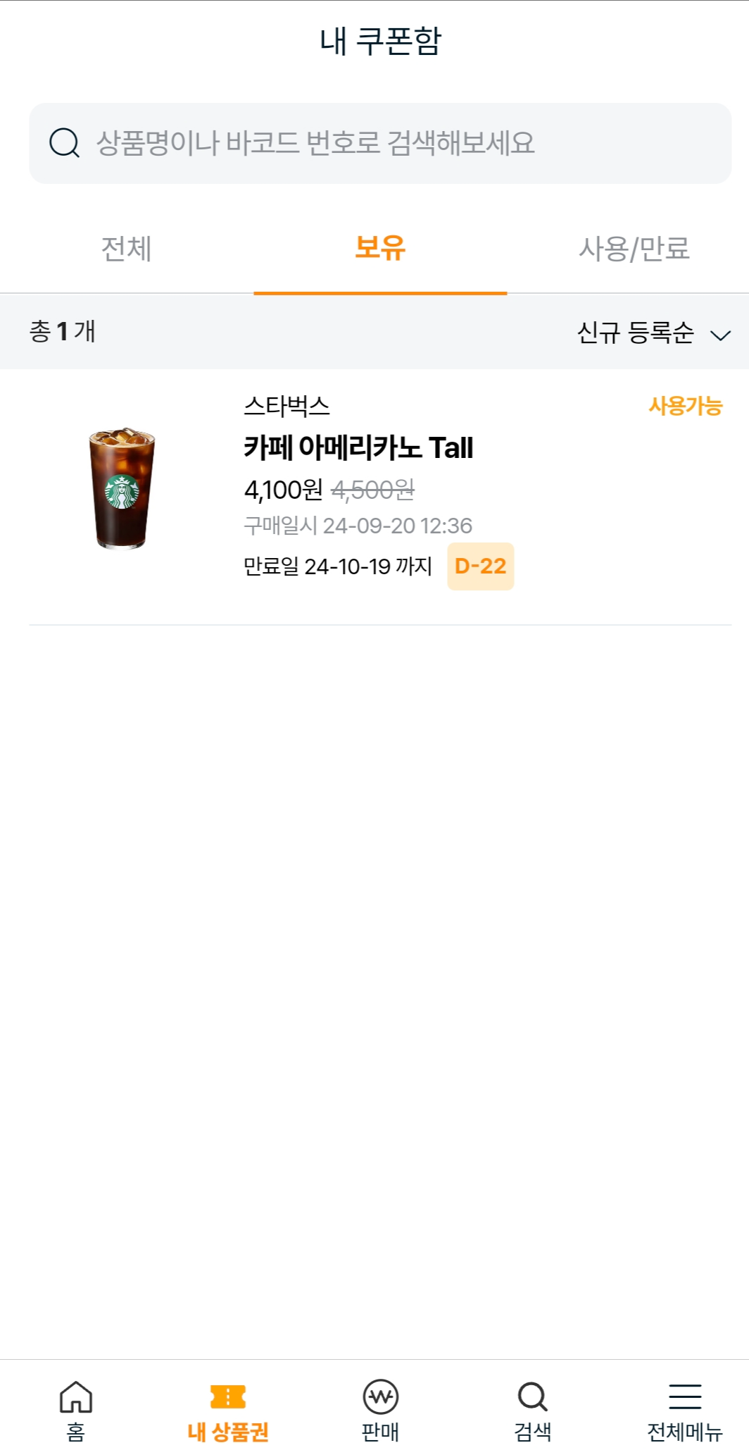 구매를 하면 내 쿠폰함에 기프티콘이 들어옵니다. 스타벅스 매장에서 직접 주문해도 되지만 저는 스타벅스 어플에서 주문한답니다. 간혹 어플에서 사용 불가한 쿠폰도 있으니 구매하실 때 주의하셔요.