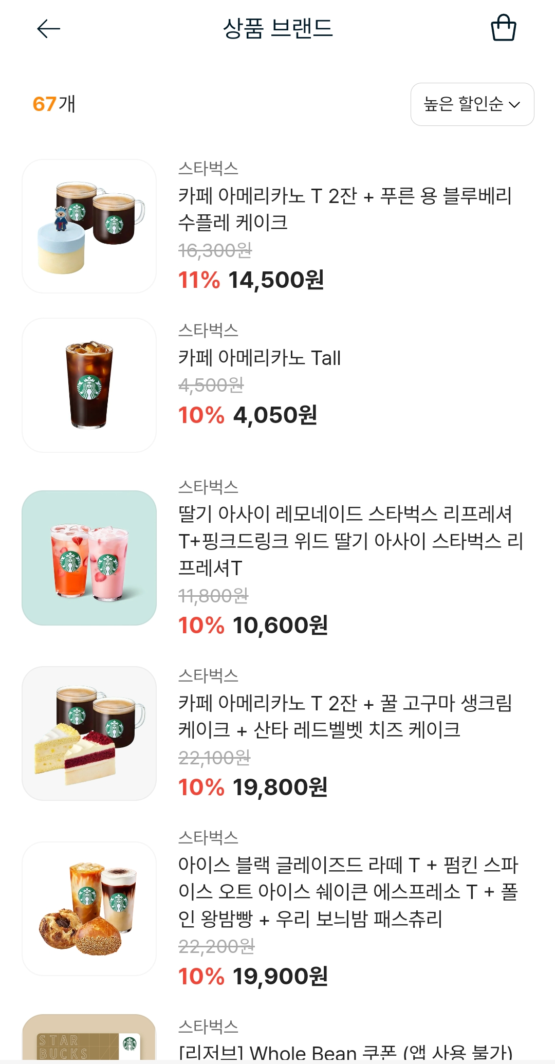 저는 주로 스타벅스 아메리카노를 구매합니다. 평균적으로 10% 할인된 가격에 구매할 수 있어요. 간혹 더 저렴하게 올라오기도 하는데 금방 없어지니 보이면 빠르게 결제부터 해야해요.