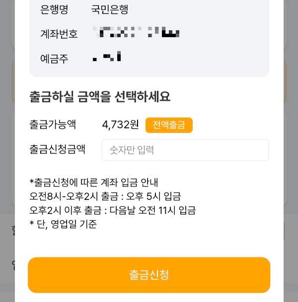 기프티캐시는 출금 신청을 하면 오전 8시 이전 신청은 11시에 입금, 8시-14시 신청은 17시에 입금, 14시 이후 신청은 다음날 입금됩니다.