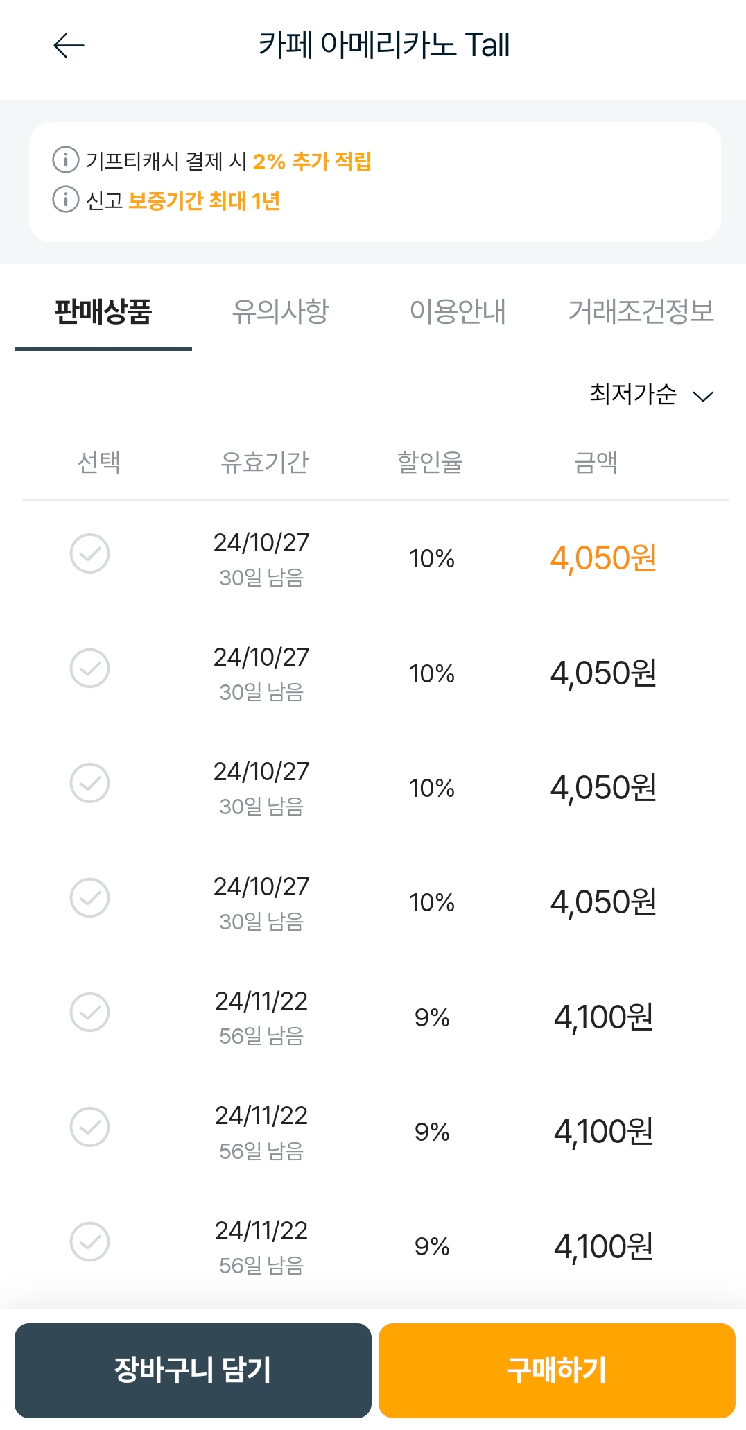 기프티콘은 기프티스타에서 직접 매입해서 판매하게 되는데요. 재고량이 너무 많거나 유효기간이 임박한 쿠폰은 판매 거절될 수 있습니다.