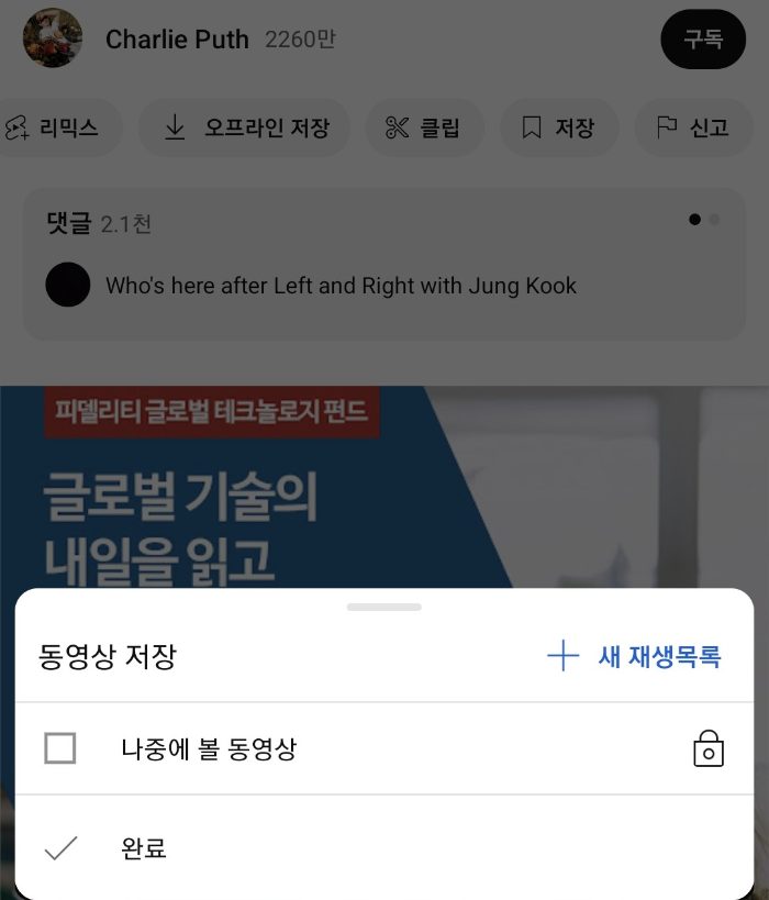 영상에서 '저장'을 눌러 원하는 이름으로 새 재생목록을 만든 후, 목록에 들어갈 영상들을 모두 저장해주면 됩니다.