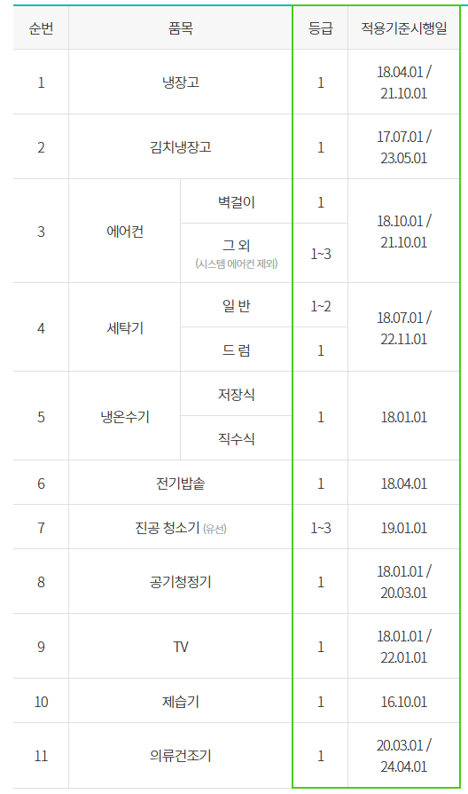 아래 11개 품목 중 에너지소비효율 “등급”과 “적용기준시행일” 2가지를 모두 충족하는 가전제품